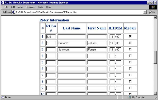The form allows RBAs to enter rider information directly or to pre-process the results with a spreadsheet and then submit that spreadsheet. It is recommended that you try these programs to determine which approach you will take. In general, RBAs with a small number of participants use the direct entry method while those RBAs with a large number of participants use spreadsheets.