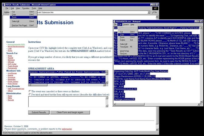 On the Results Submissions web page, paste the contents of the entire CSV file (not just the rider data) into the spreadsheet area within the form using Edit > Paste. The Results Submission Page and Notepad will look similar to the figure below.