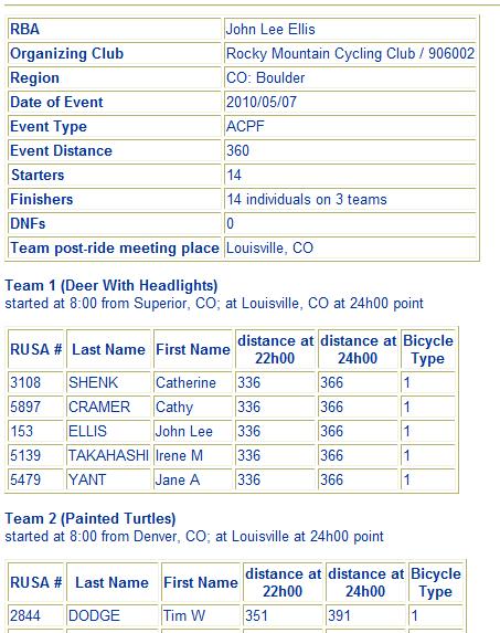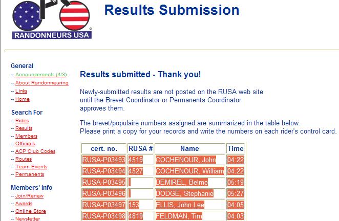 A good idea is to save the results HTML page to a file for later verification (and in the case of RUSA-sanctioned events, to produce stickers for your riders’ brevet cards - see below).