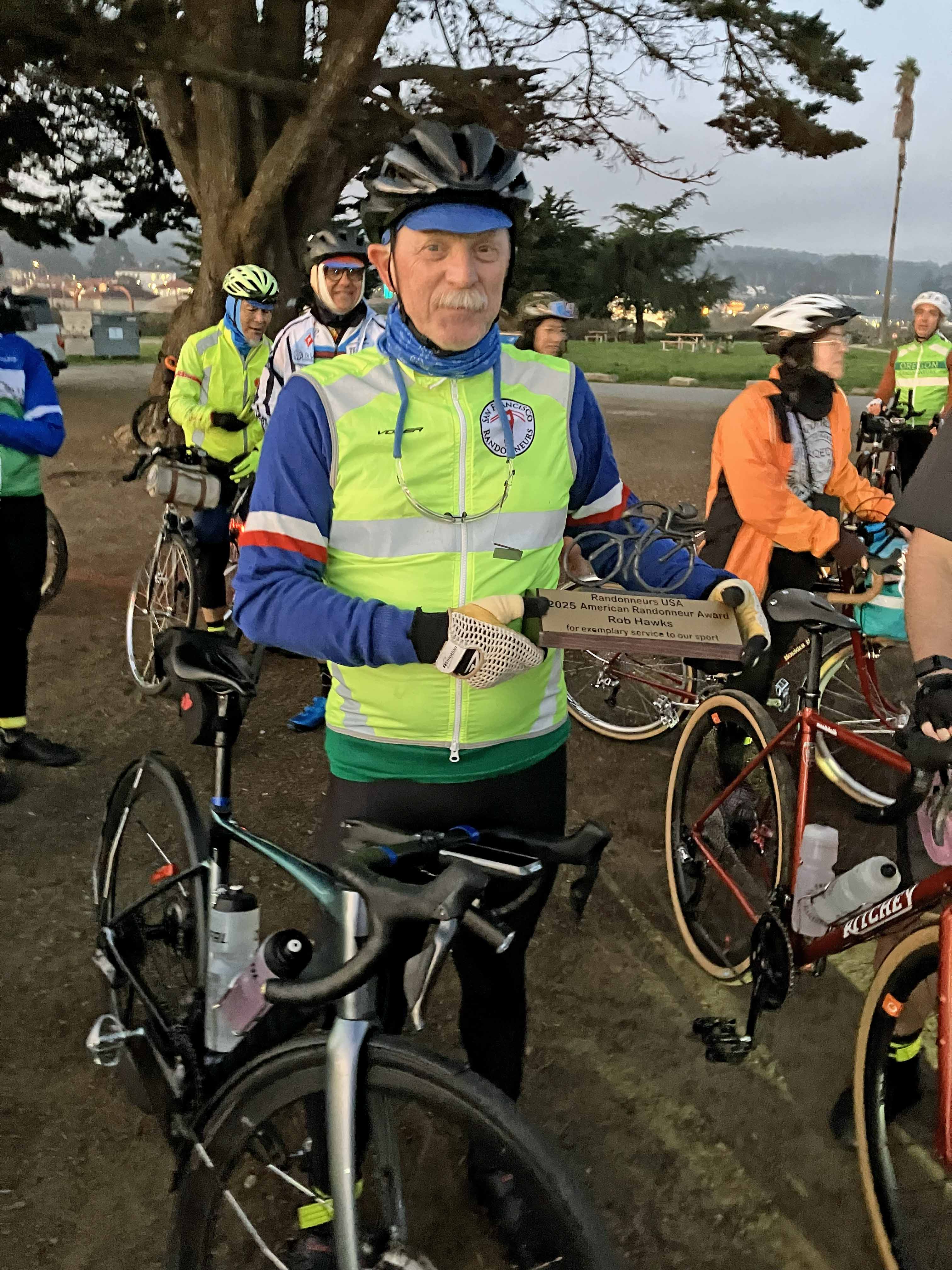 The Board of Directors is pleased to announce that the 2025 American Randonneur Award has just been awarded to Rob Hawks (#2515). Rob has been a member of Randonneurs USA since 2004, and San Francisco RBA since 2008. He has been President and Vice President of RUSA, as well as serving as RBA Liaison 2021-2024. Rob is chair of the Brevet Coordinator Committee and is a member of the Membership Committee. Additional details will be in the next issue of our American Randonneur magazine as well as the February issue of Between Controls, our monthly newsletter. |